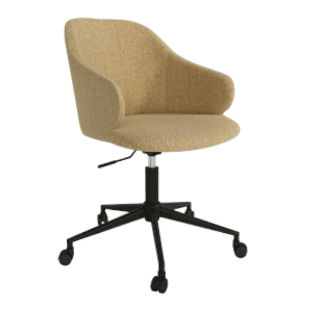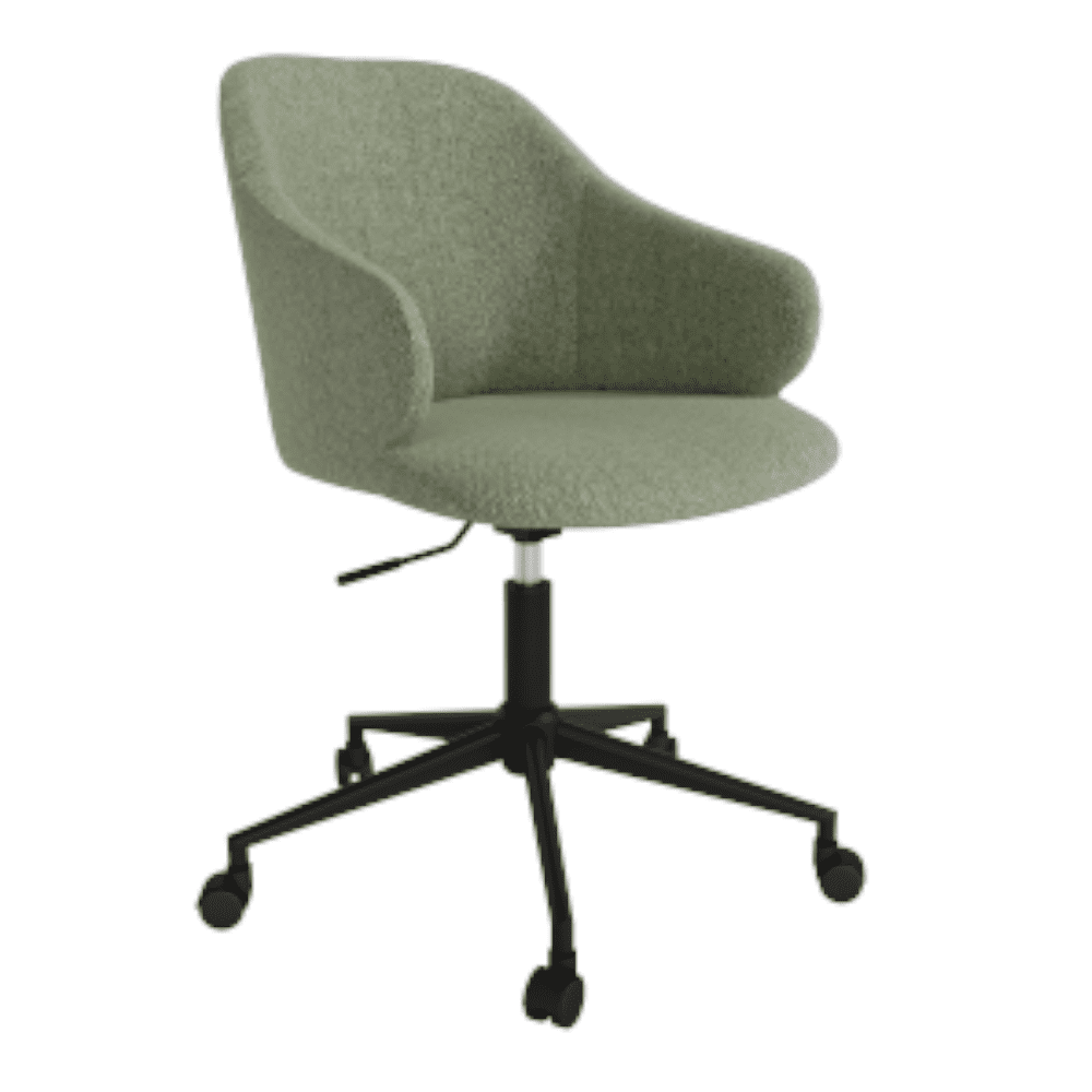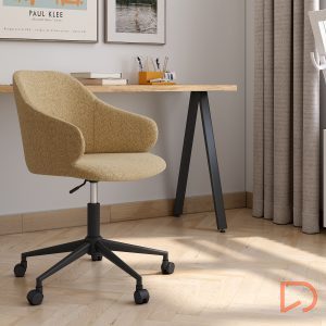 - El tejido tiene una textura sofisticada que contrasta de forma elegante con las formas suaves de la silla. Las patas negras le dan un estilo moderno al diseño y aseguran que sea resistente y duradero.