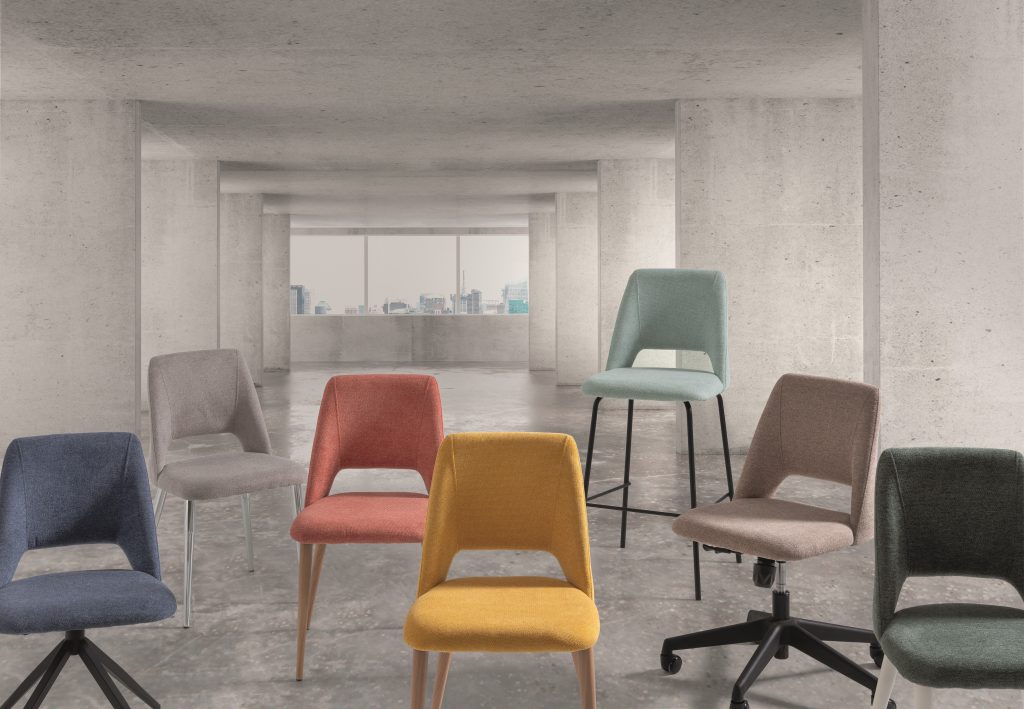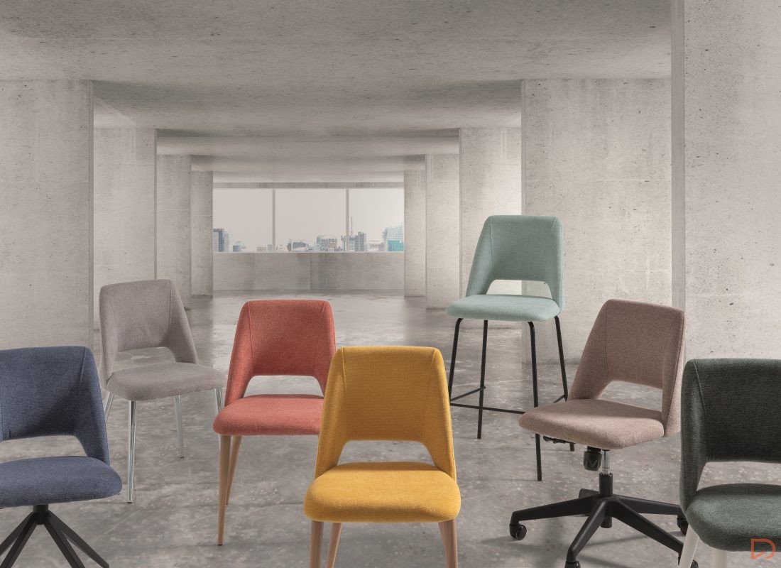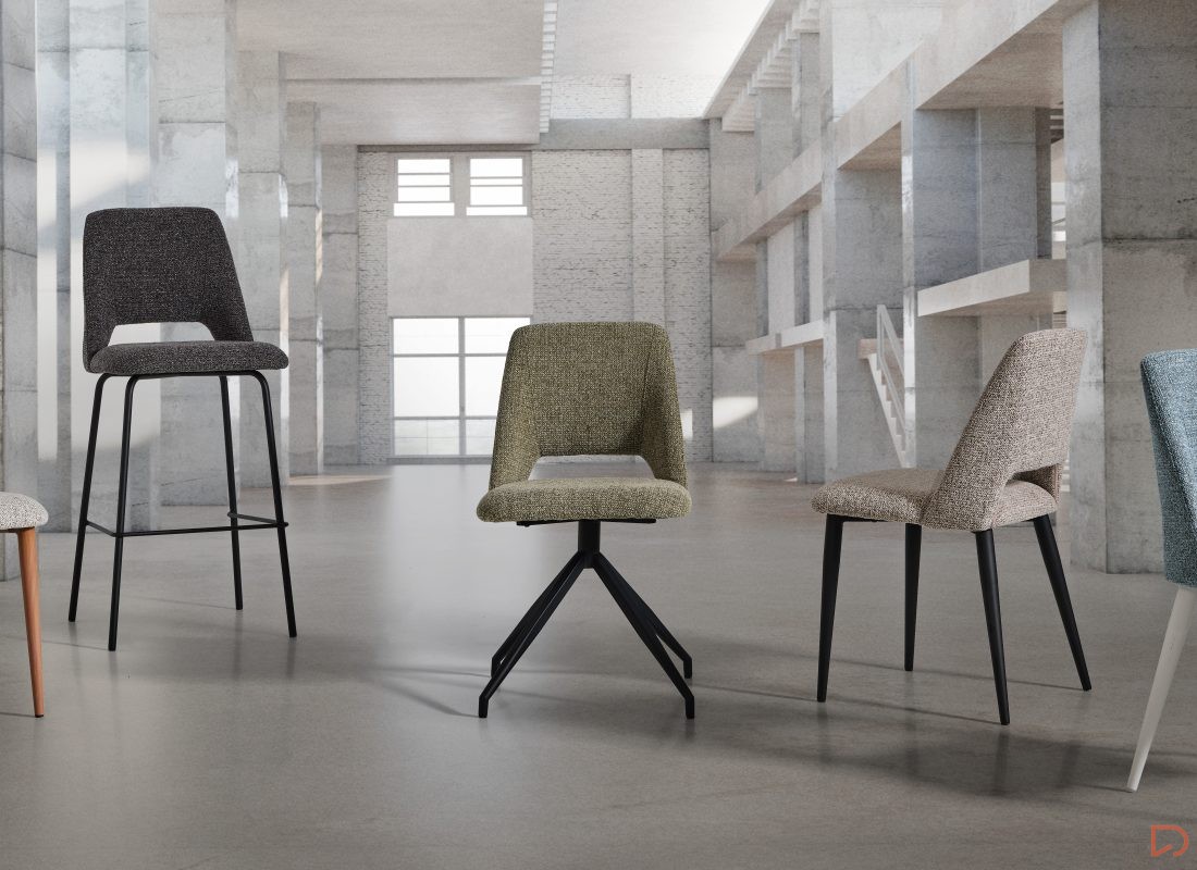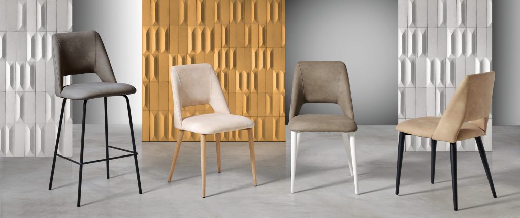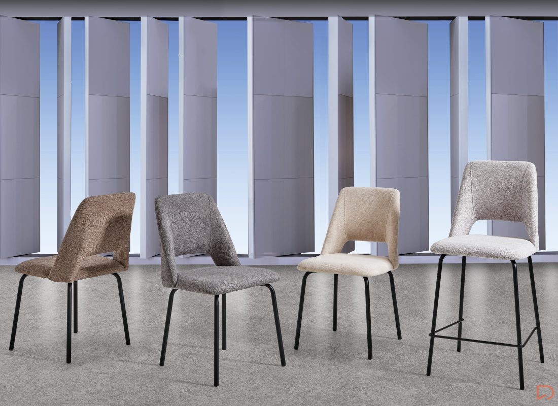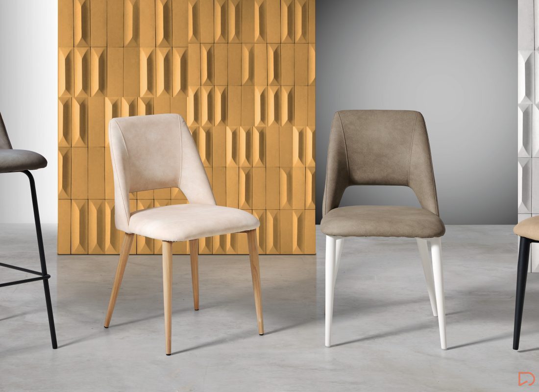 - La silla FRIDA & GRETA combina su asiento y respaldo tapizados en un tejido texturizado o similar a la piel en diferentes tejidos.