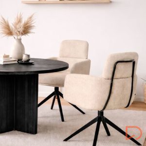 - En cuanto a su diseño estético, las patas metálicas en color negro, junto con el detalle metálico en la parte trasera del respaldo, aportan un estilo moderno y sofisticado que se integra perfectamente en espacios contemporáneos. Además, incorpora un mecanismo de giro de 360º con función de retorno automático, asegurando comodidad y versatilidad en su uso.