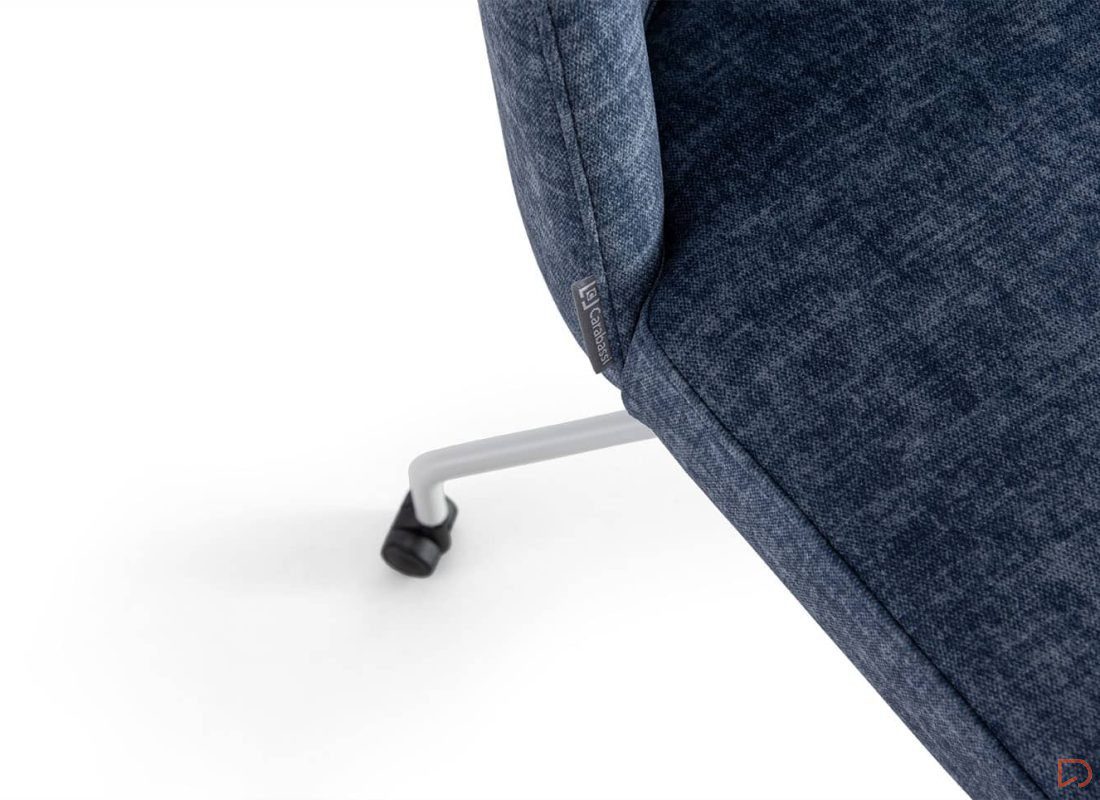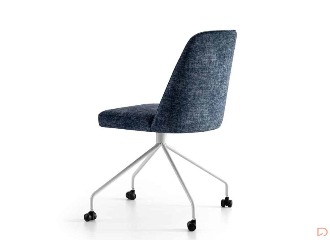 - La silla para Oficina, con su tapizado en tela azul de aspecto denim y base giratoria de metal blanco, ofrece una combinación de estilo y funcionalidad.