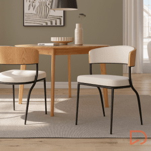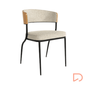 - Ofrece acabados en tono roble natural y patas en negro, asientos y respaldo tapizados en nácar o jaspe.