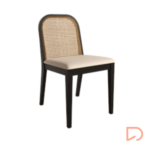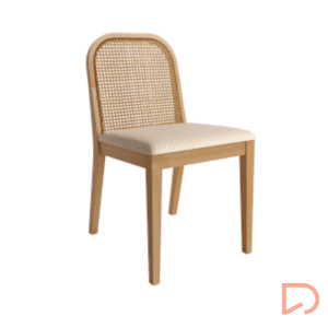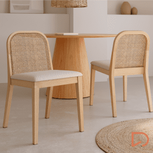 - Ofrece acabados en tono roble, el asiento en nácar y respaldo en ratán.