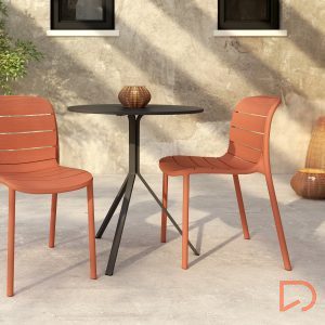 - Silla de polipropileno apilable apta para exteriores, disponible en varios acabados y tonos.