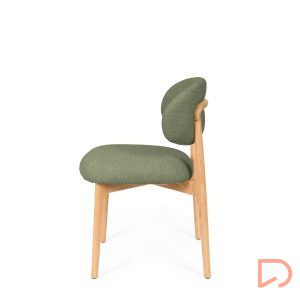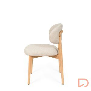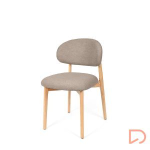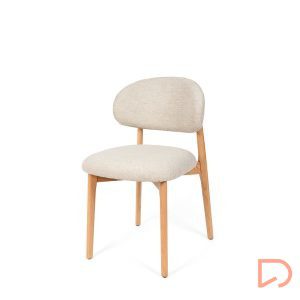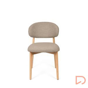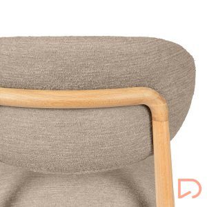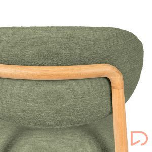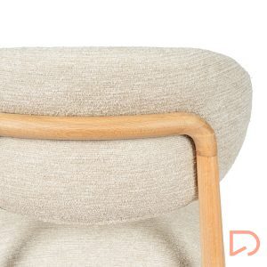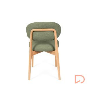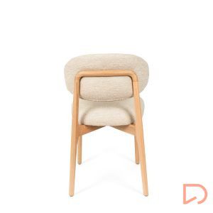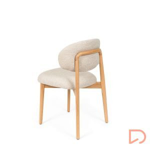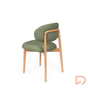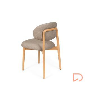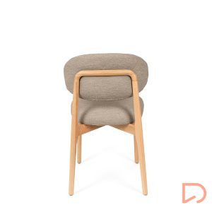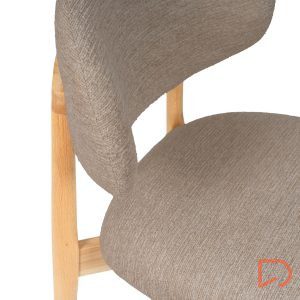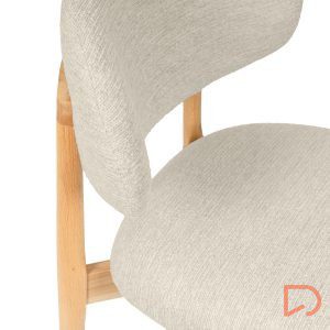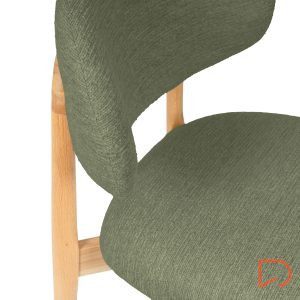 El respaldo y el asiento, tapizados en tejido suave y disponible en tres tonos neutros —beige, verde y taupe—, invitan al confort sin perder de vista la estética. Pero es su parte trasera la que revela un detalle único: una estructura de madera vista que enmarca el respaldo con un diseño curvo y artesanal, convirtiendo la silla en un objeto decorativo incluso cuando se observa desde atrás.