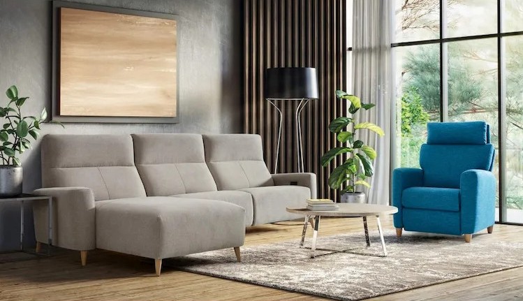 - También disponible en versión sofá o Cheslong, con mecanismo gravity deslizante, que permite tener arrimado a la pared, esta versión incluye cabezal reclinable sin elevación.