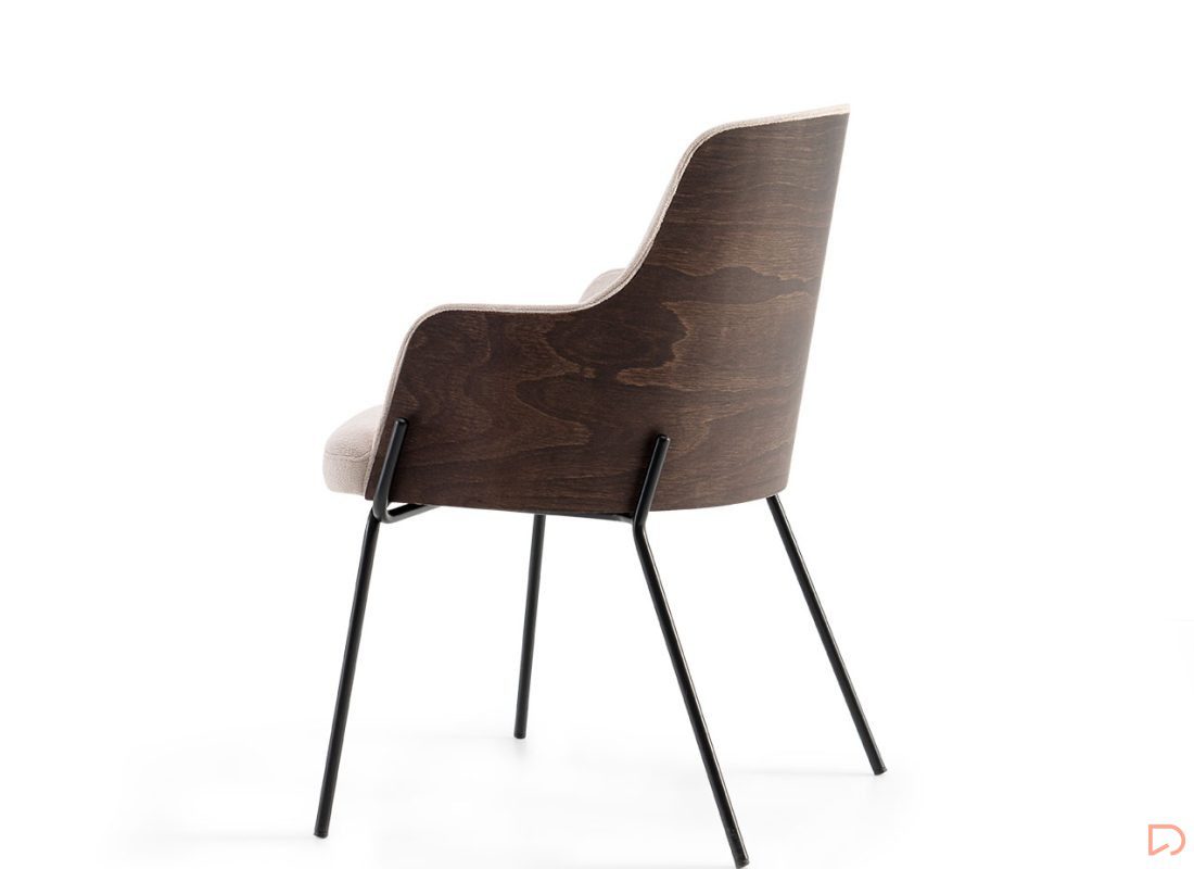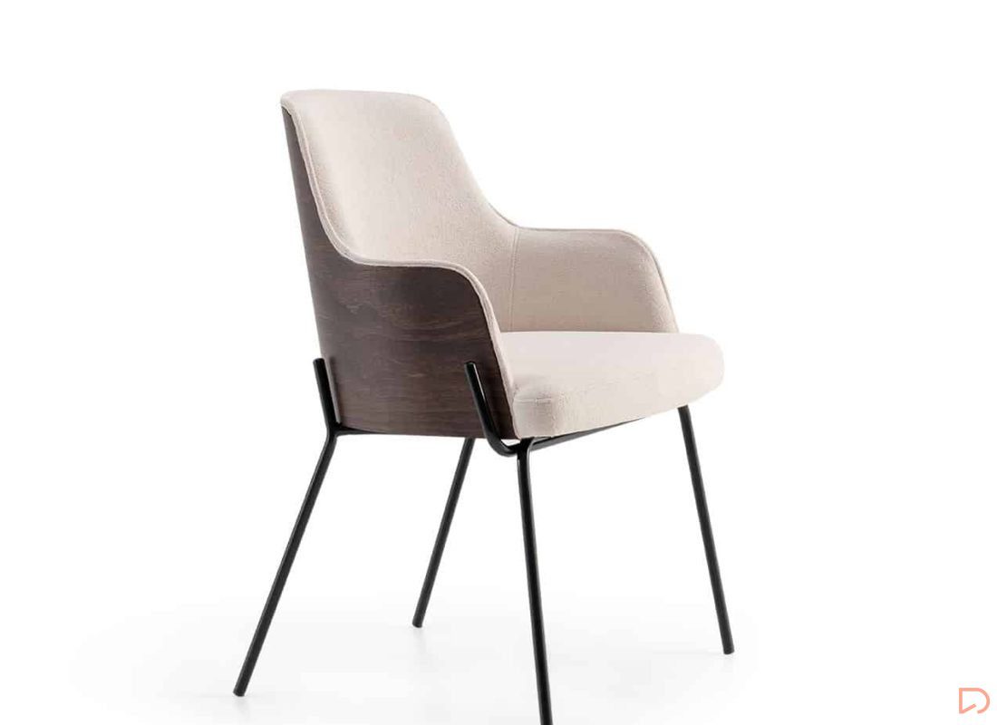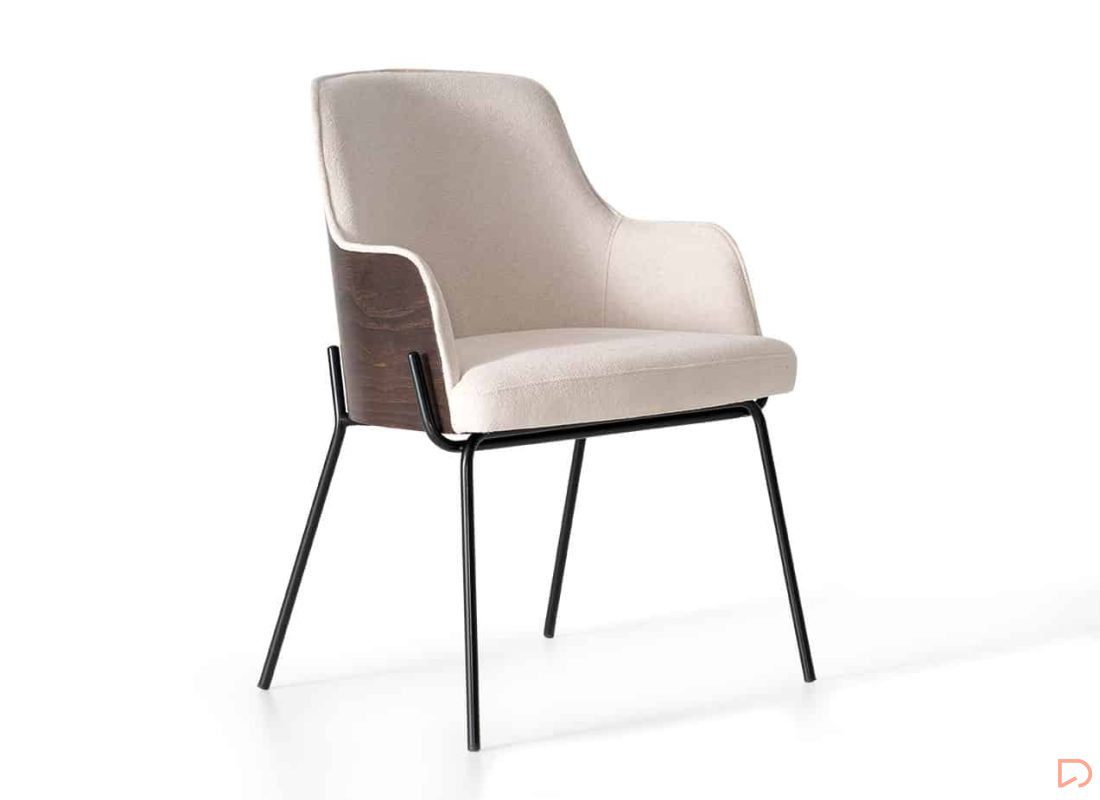 - El Sillón con estructura de metal combina sofisticación y modernidad. Su diseño incorpora un tapizado en tono beige claro que contrasta elegantemente con los detalles oscuros de madera en el respaldo y las patas metálicas negras que aportan estabilidad y un toque industrial.