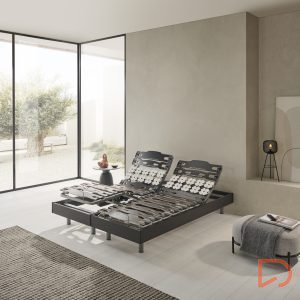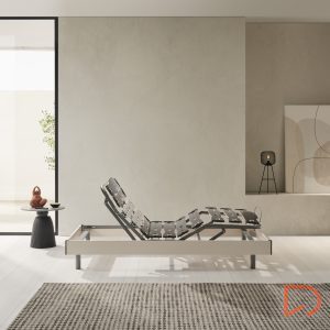 - 5 planos articulados por motor doble con mando inalámbrico. Plano lumbar fijo, que a su vez incorpora doble lama, y cursores especiales para la regulación de firmeza