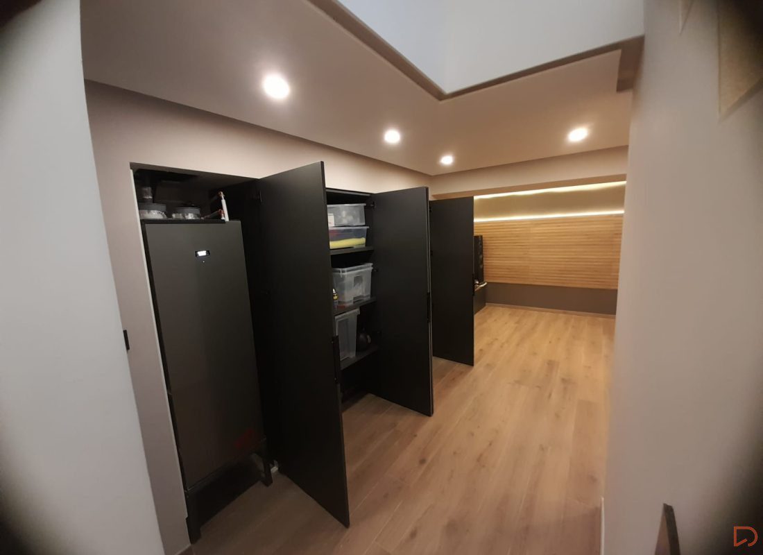 - Espacio de almacenaje integrando el equipo de aerotermia en su interior, armario a medida con suelo visto perfecto para almacenar enseres voluminosos.