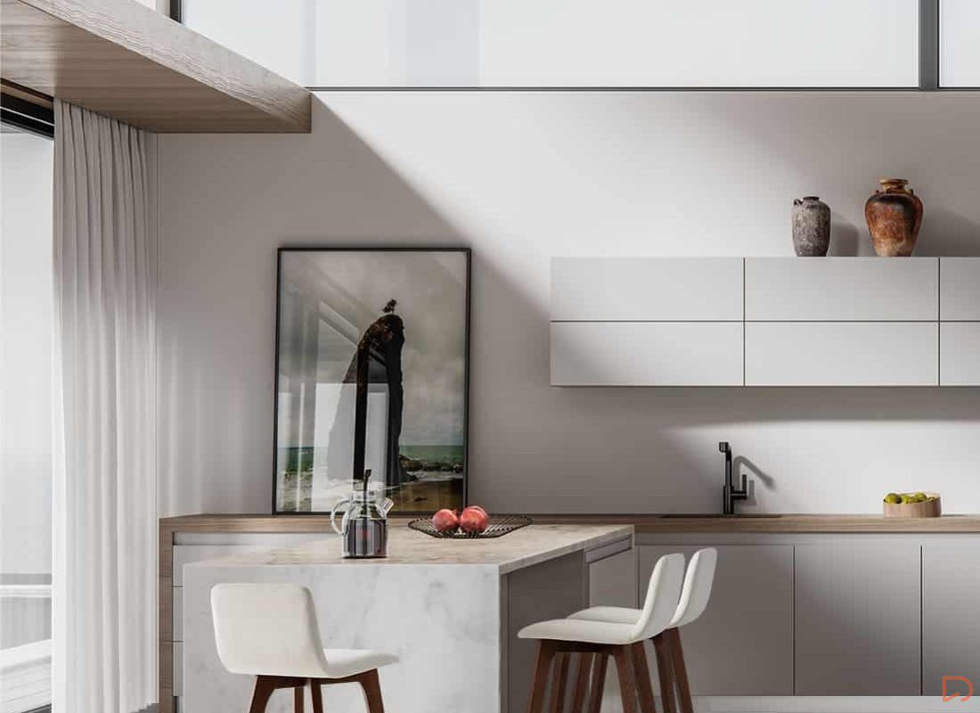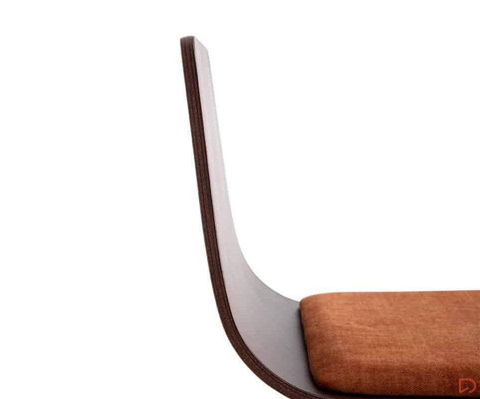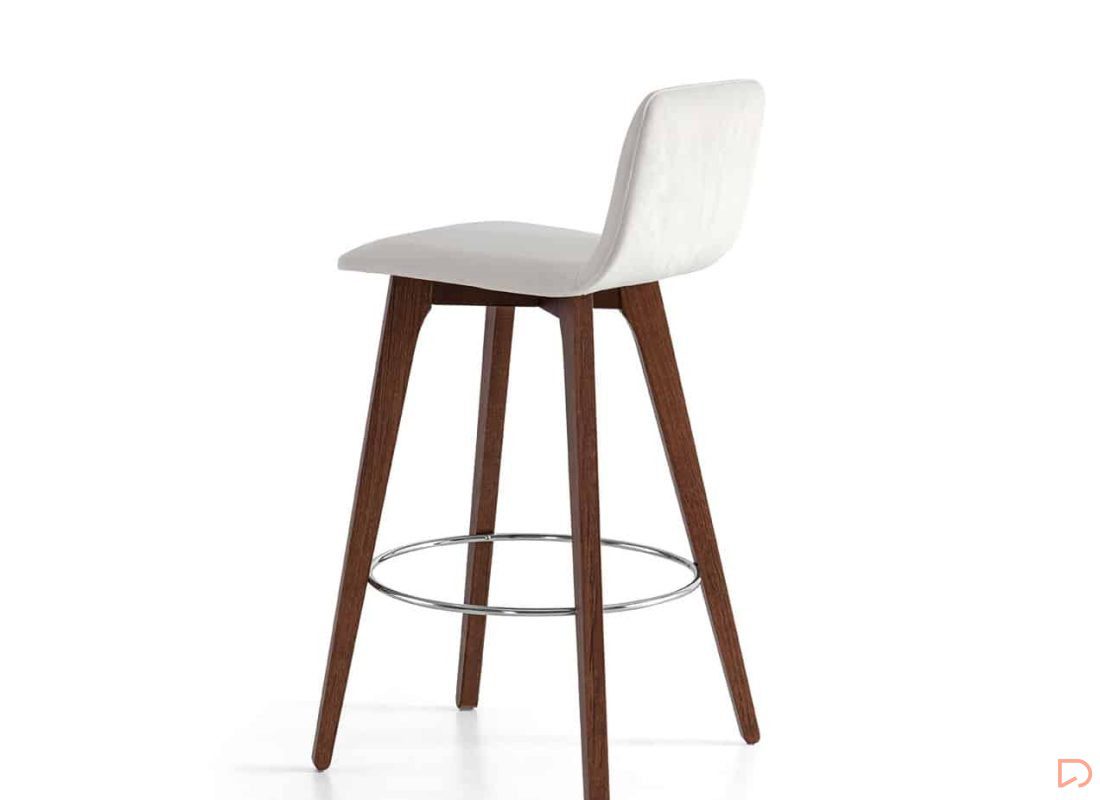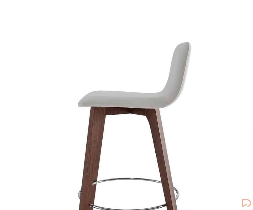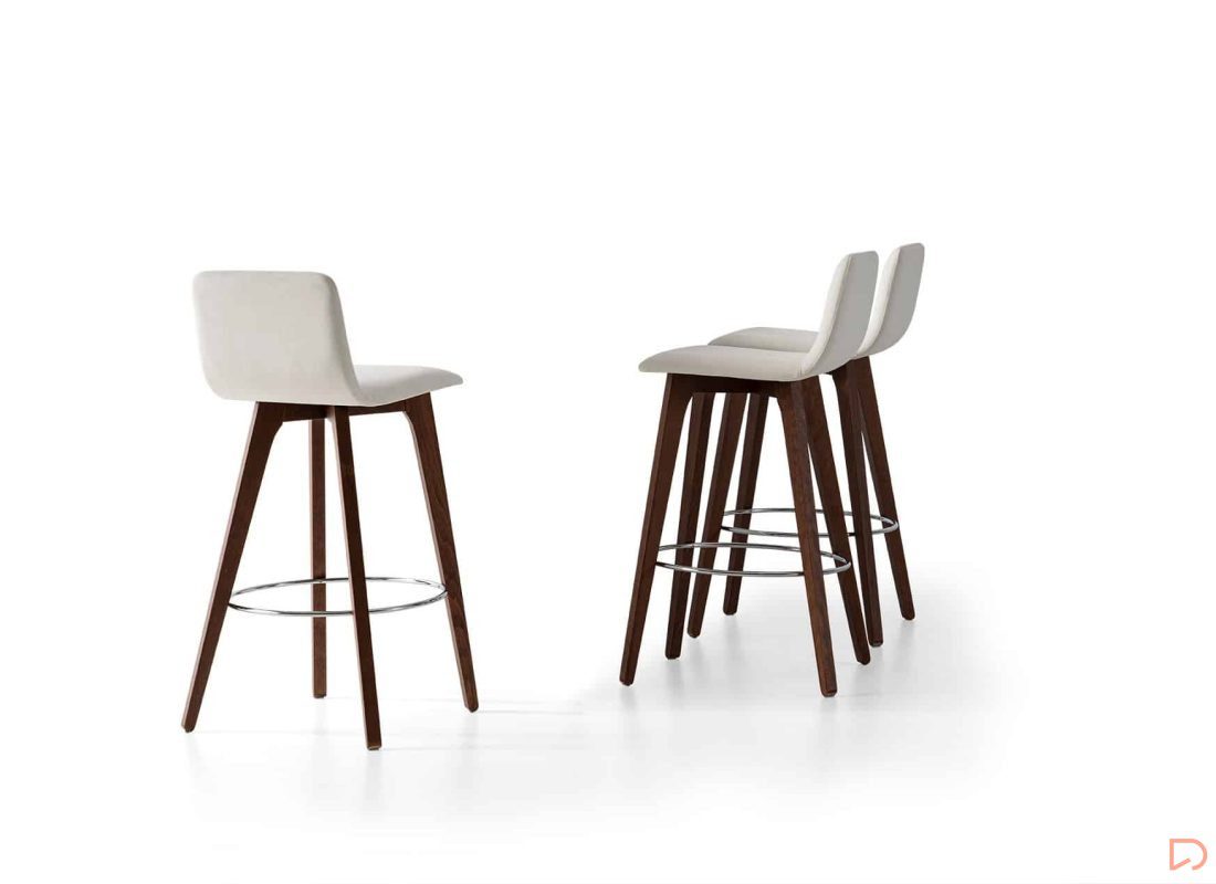 - El asiento en cuero se apoya sobre unas elegantes patas de madera de nogal, culminando en un reposapiés circular de metal cromado. Esta pieza no solo brinda una experiencia de asiento excepcional, sino que también añade un toque de sofisticación minimalista a cualquier barra o isla de cocina contemporánea.
