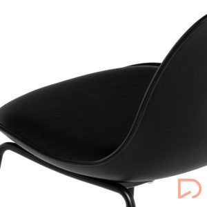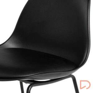 Sus patas metálicas, también en negro, incluyen un reposapiés cuadrado con una ligera inclinación, proporcionando mayor estabilidad y un aspecto más refinado.