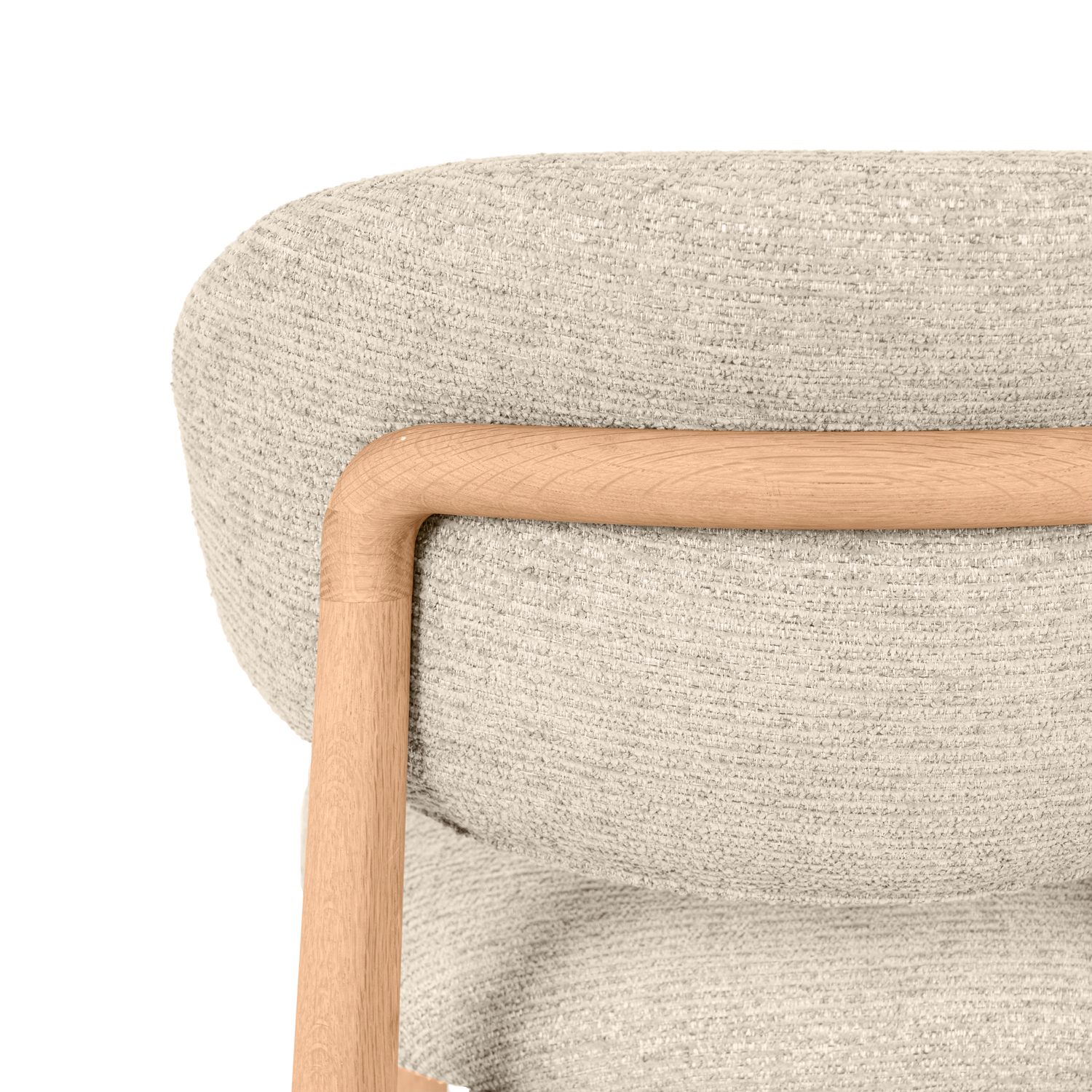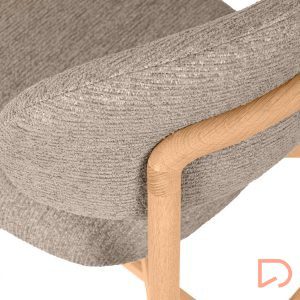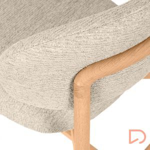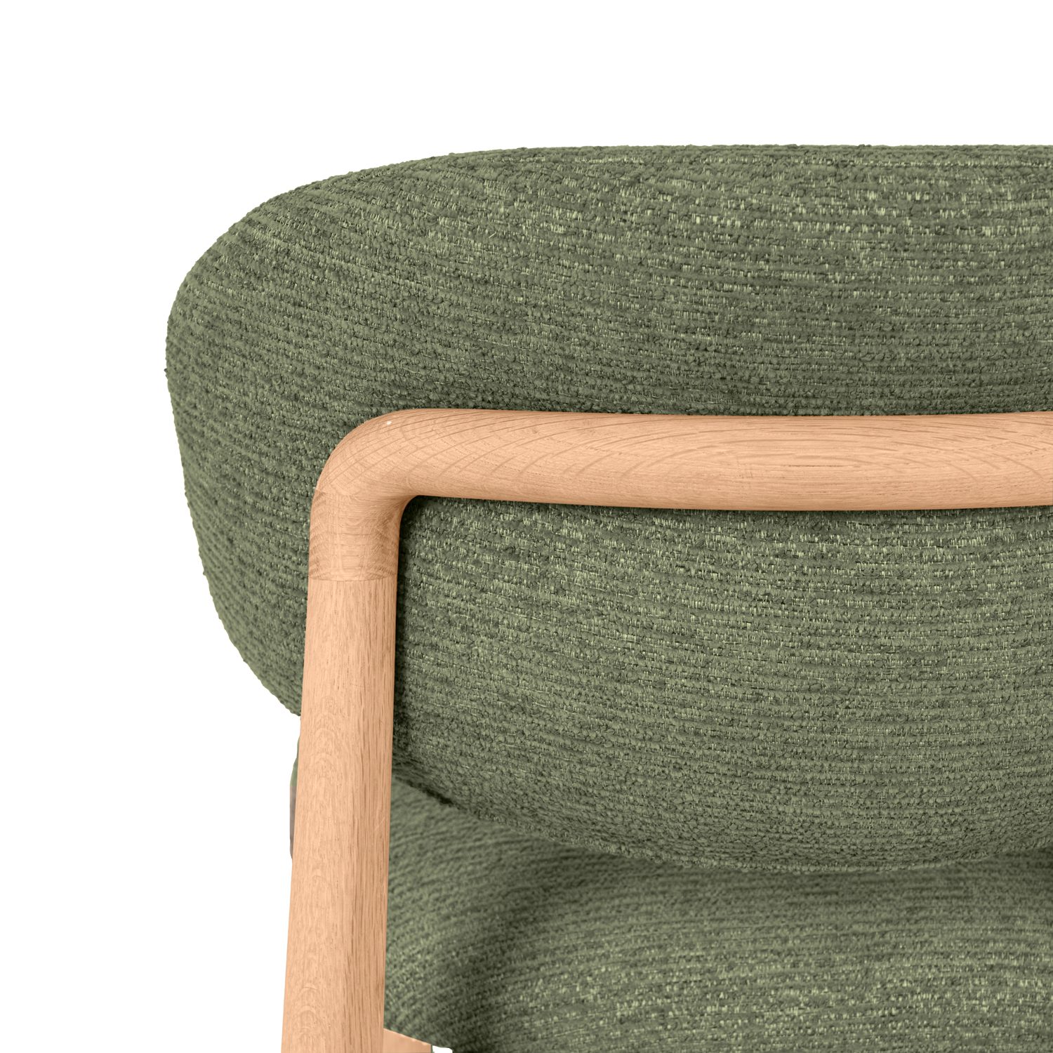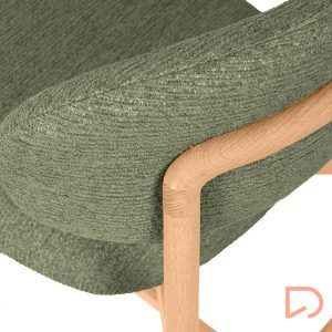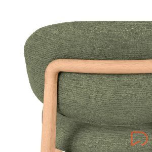 Está disponible en tonos beige, verde y taupe, y uno de sus mayores atractivos es la estructura trasera en madera vista, que enmarca el respaldo con elegancia y se convierte en un detalle distintivo cuando se observa desde cualquier ángulo.