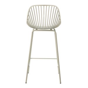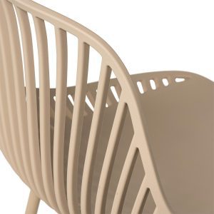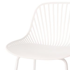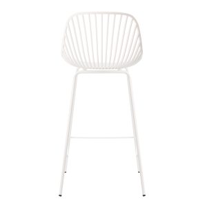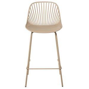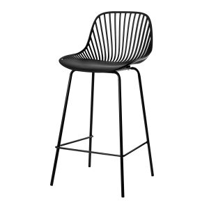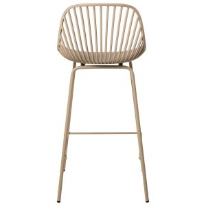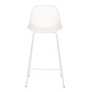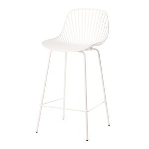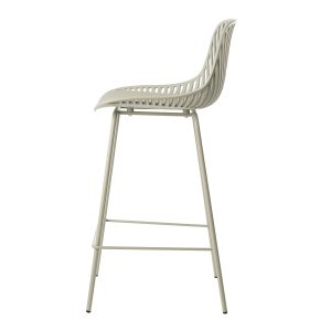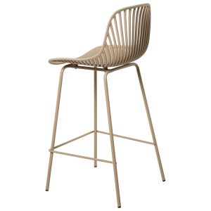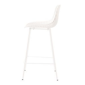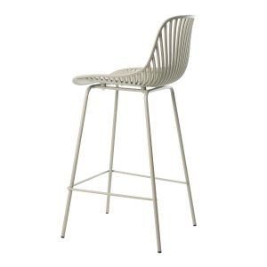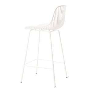 - El taburete bajo PEYTON destaca por su diseño original, con un respaldo abierto compuesto por pequeñas barras verticales y un asiento de polipropileno en colores negro, blanco, beige y menta, todo en una misma pieza.