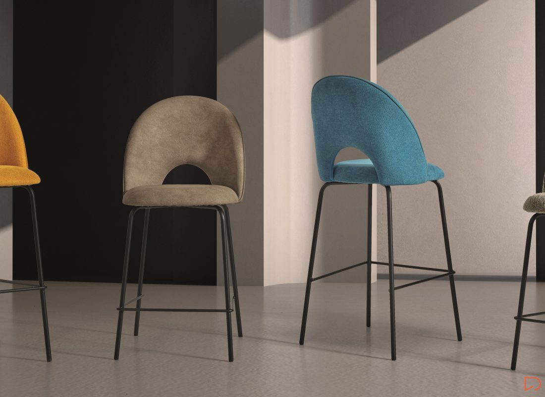 - El taburete RYTA & RAQUEL combina su asiento y respaldo tapizados en un tejido texturizado en diferentes tejidos.
