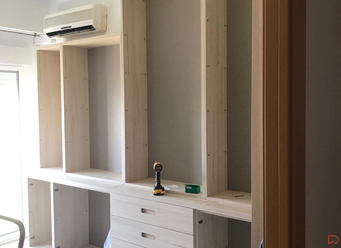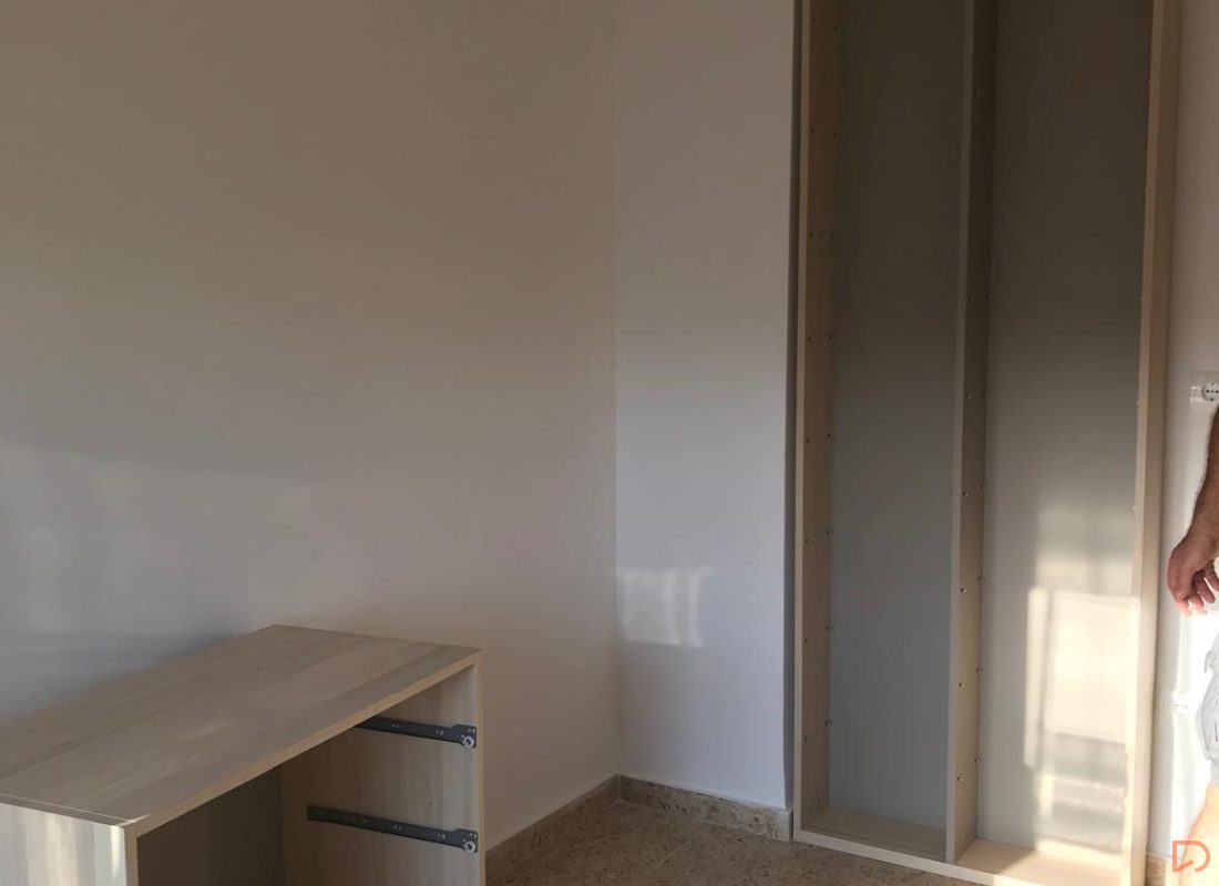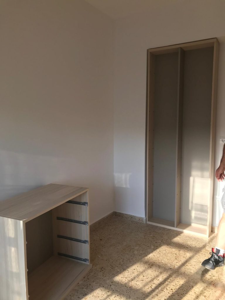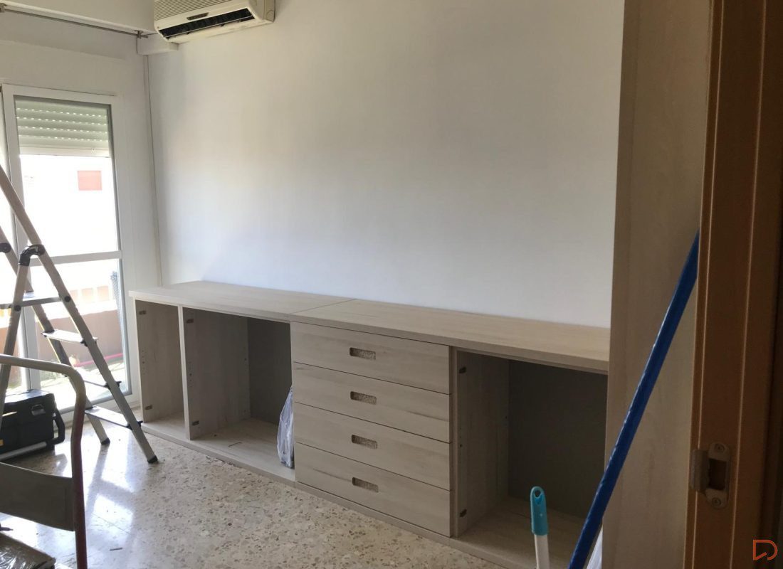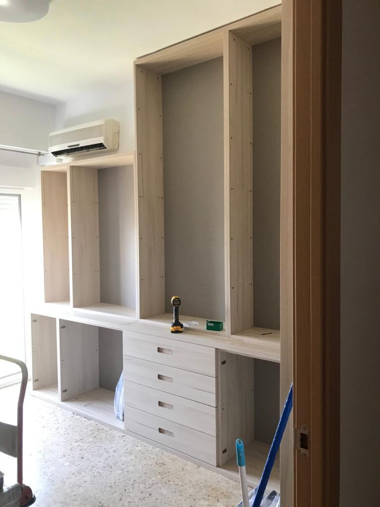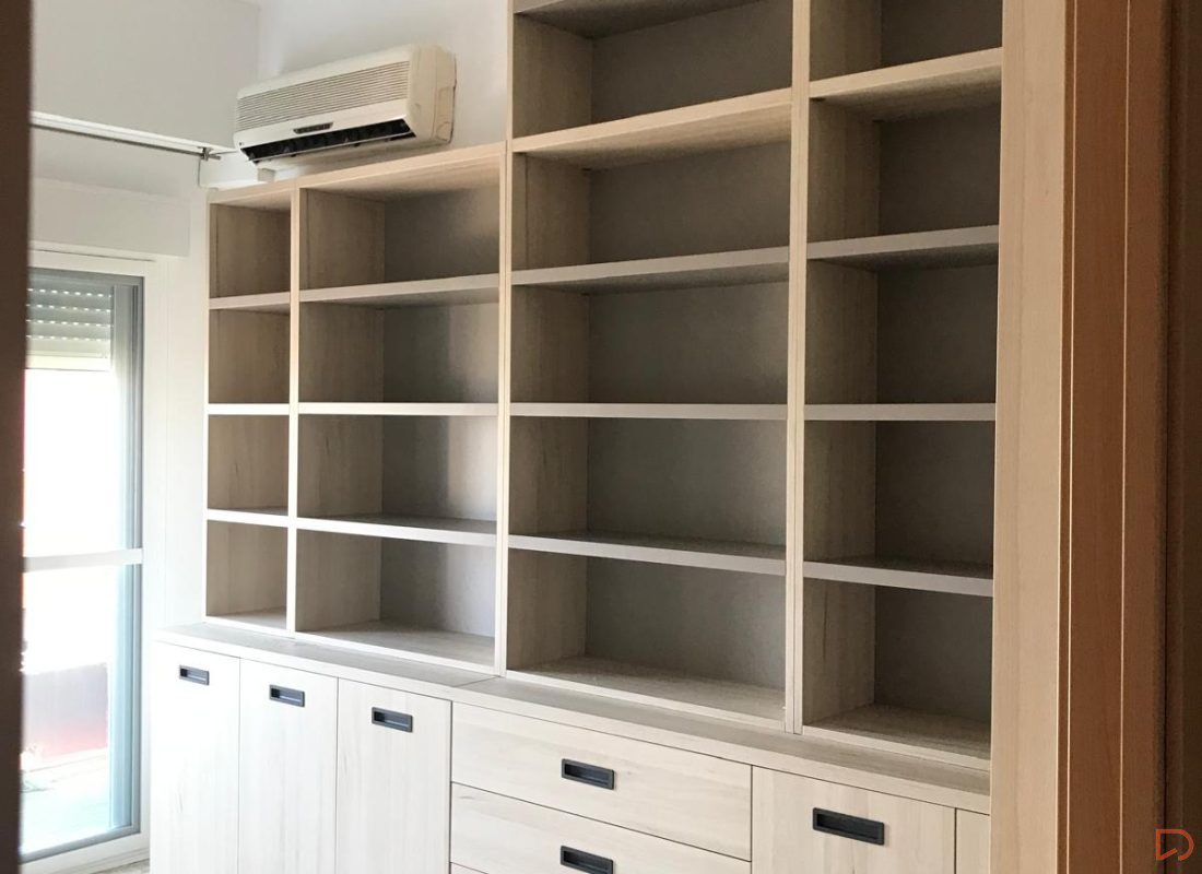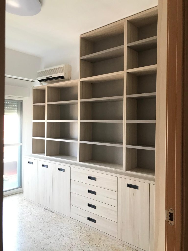 También hemos compuesto este espacio con una estantería que ocupa prácticamente todo el espacio de la pared, compuesta con cajones, puertas cerradas y muchos estantes, con los mismos acabados y tonos que la zona de estudio, ganando en neutralidad y sencillez.