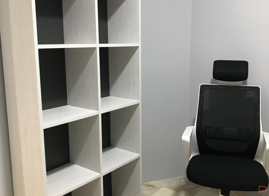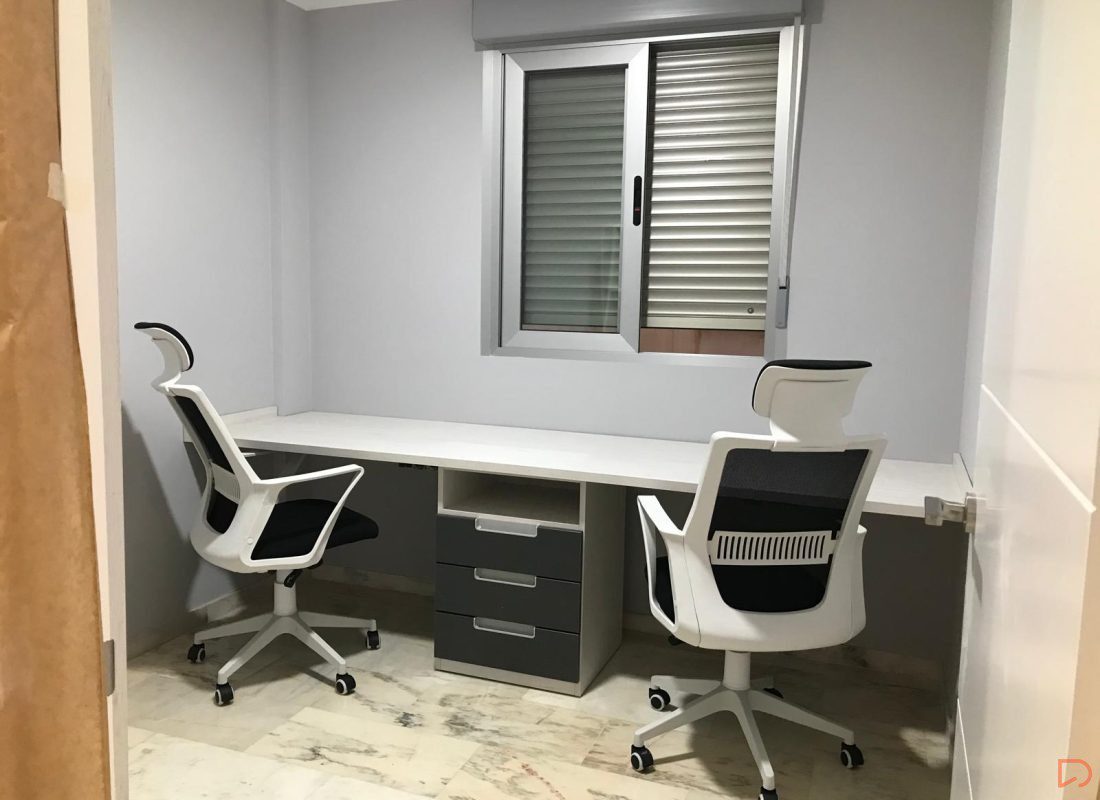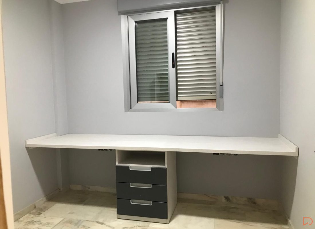 Os presentamos esta zona estudio, hemos incorporado a una habitación pequeña una encimera que va de pared a pared para aprovechar al máximo el espacio, incorporando una cajonera para hacer dos espacios diferenciados.