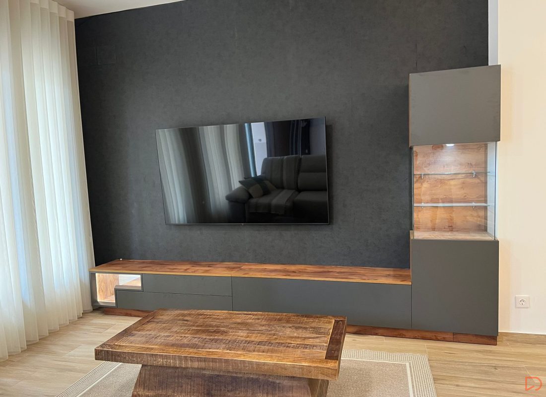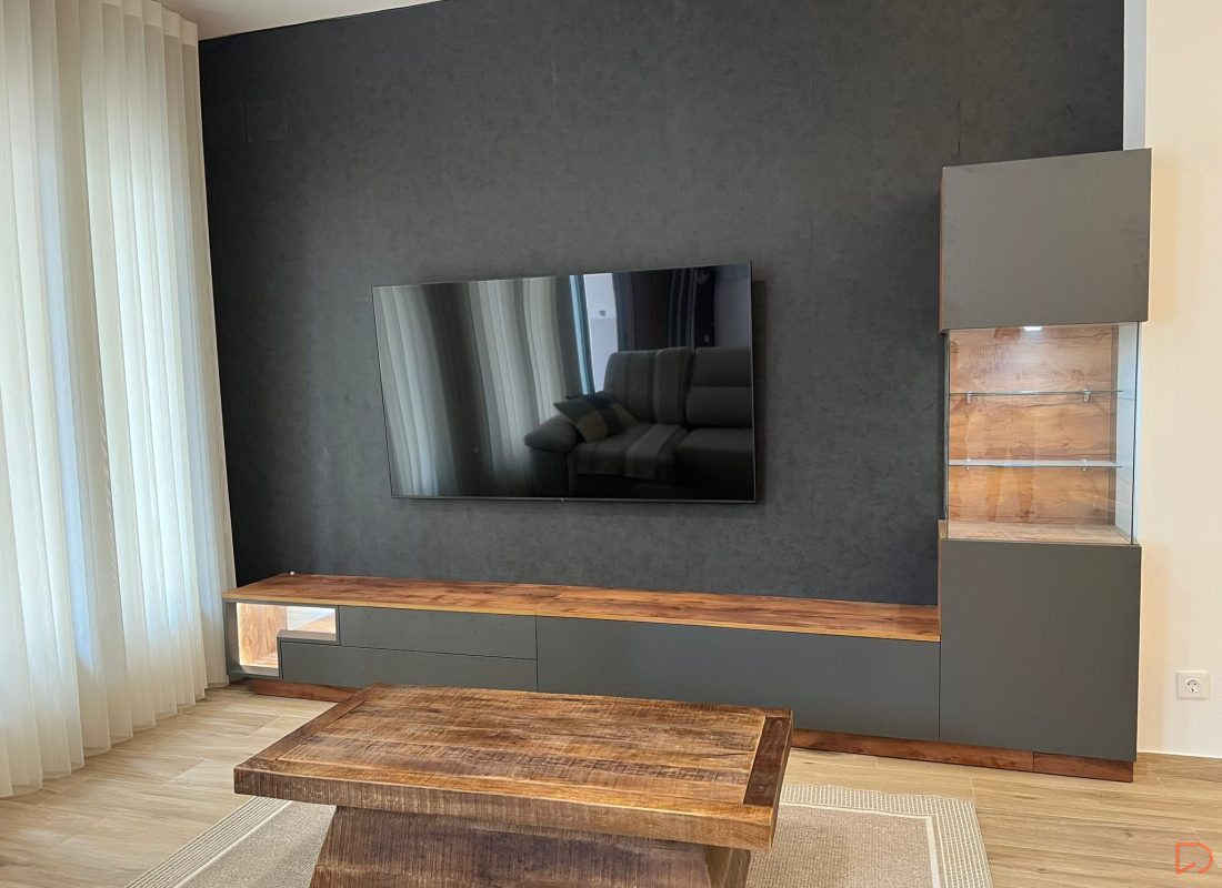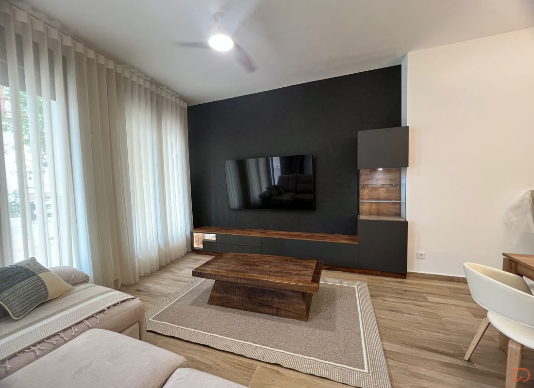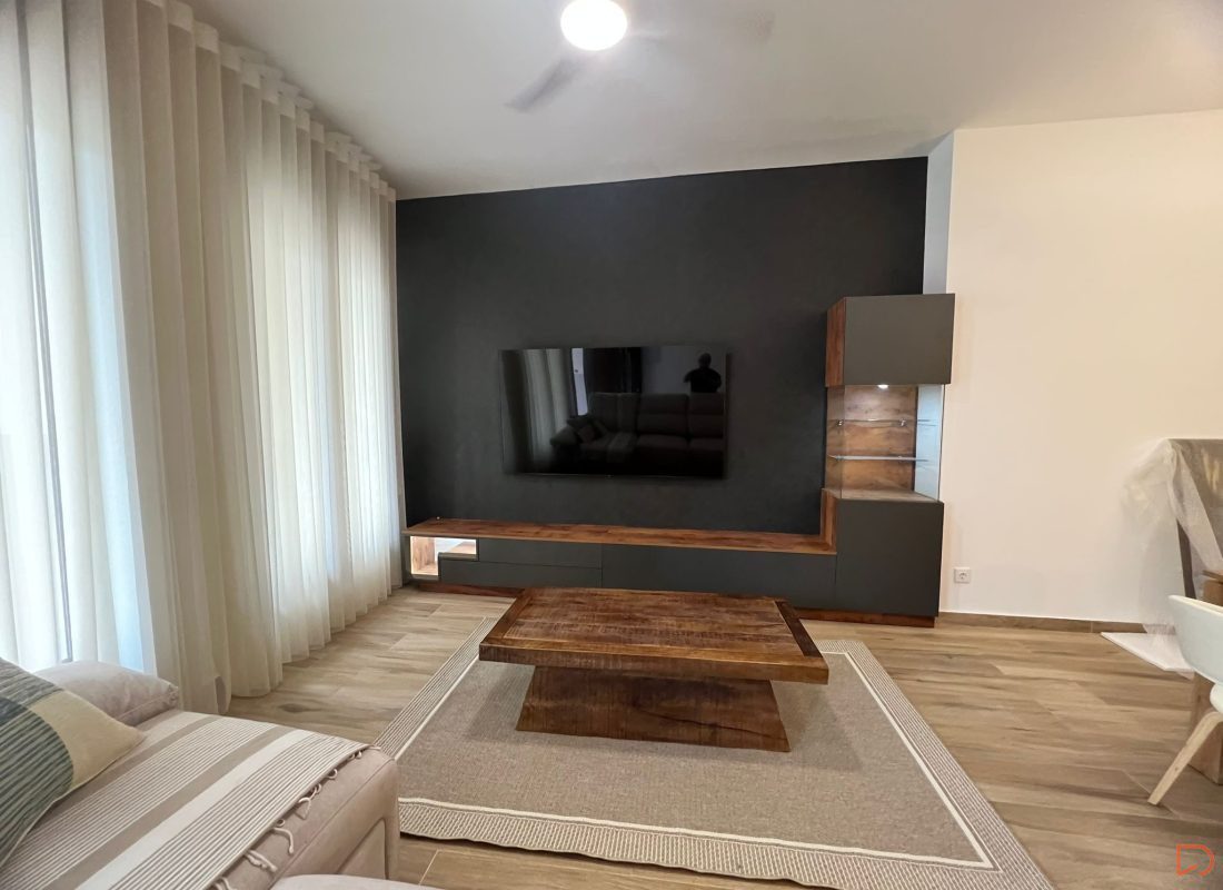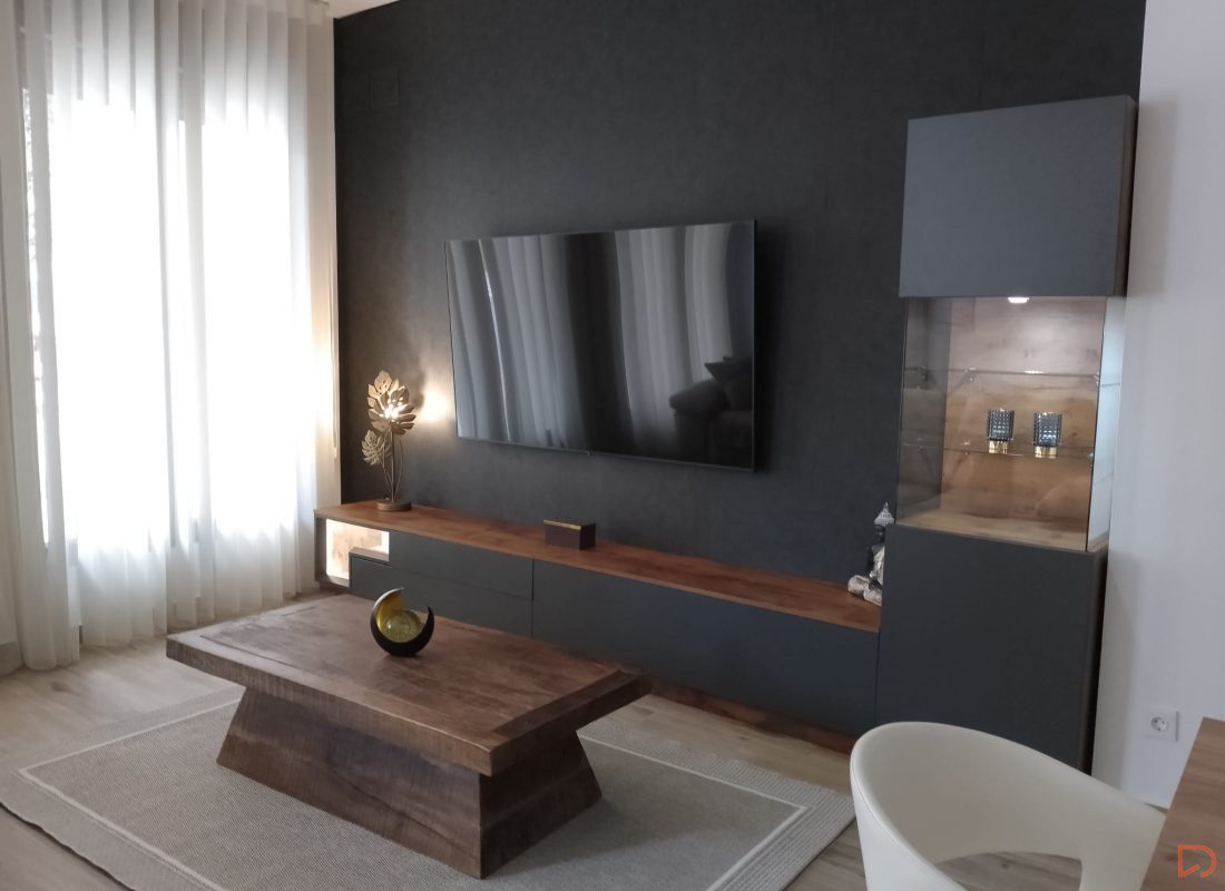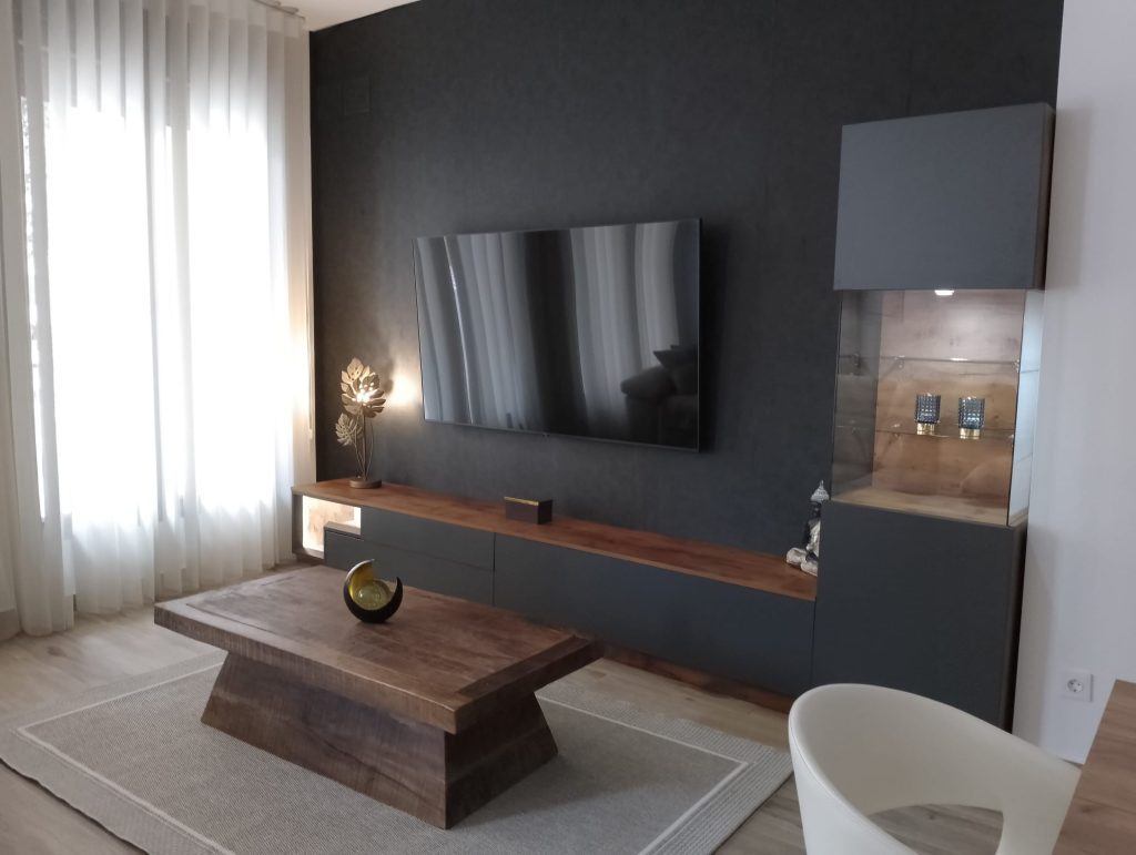 Este salón tiene un diseño moderno y minimalista con una paleta de colores neutros y cálidos. Destaca una pared en tono oscuro donde está montado un televisor de pantalla plana. El mobiliario combina un acabado imitación madera muy bien conseguido con acabados en gris pizarra, incluyendo un mueble bajo y una vitrina con iluminación. En el centro hay una mesa de centro hay una mesa de centro robusta de madera maciza. La decoración incluye una figura de Buda, una lámpara decorativa metálica y un adorno moderno sobre la mesa. Las cortinas blancas permiten una iluminació9n suave y natural.